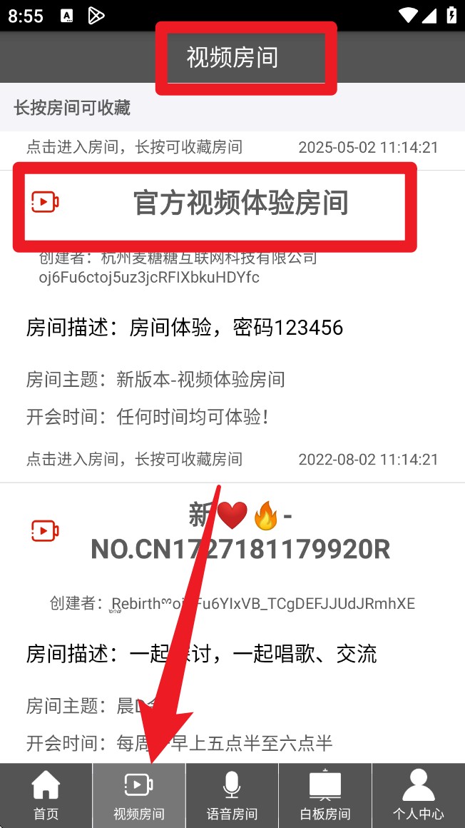 2. 切换到「视频房间」页签后,可浏览各类公开会议,点击进入即可参与或体验视频会议。