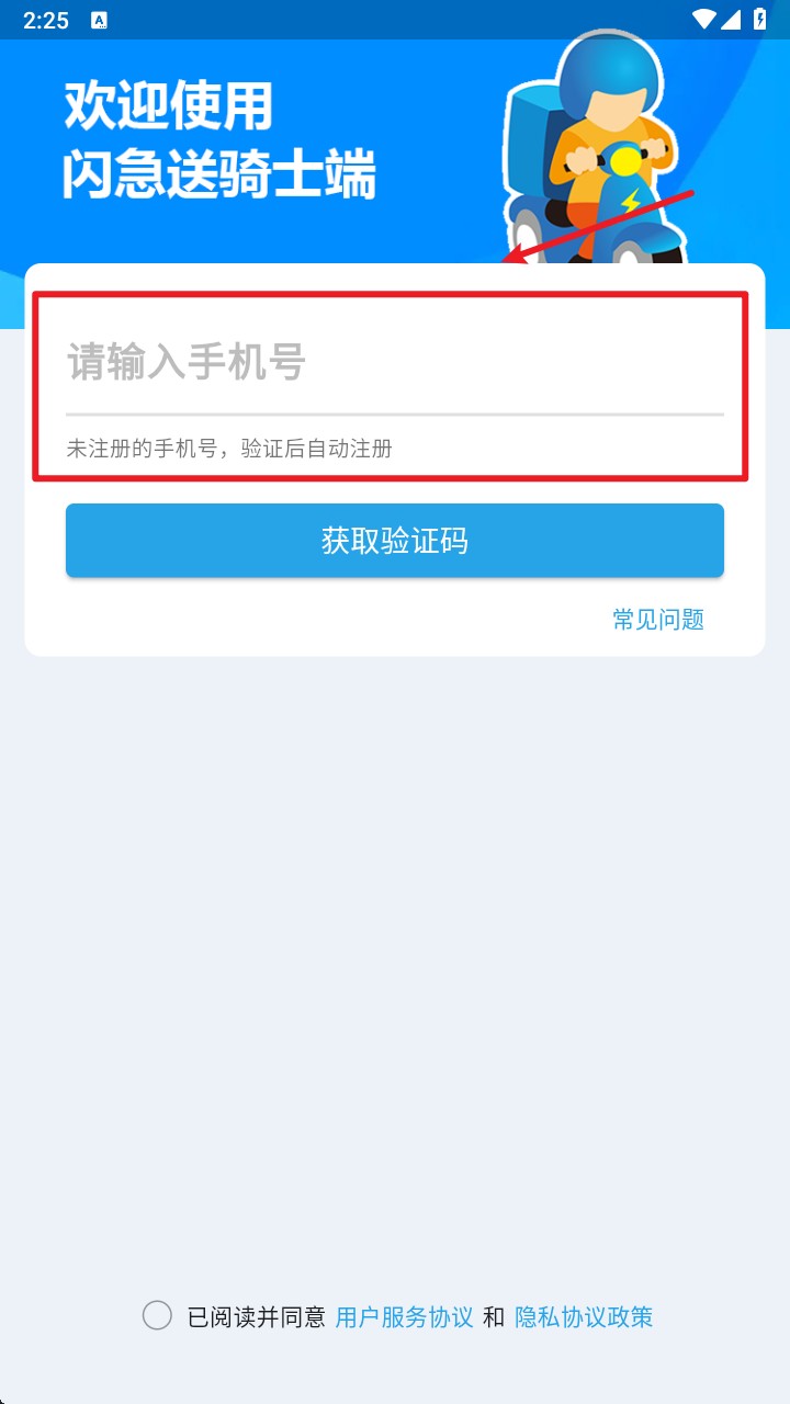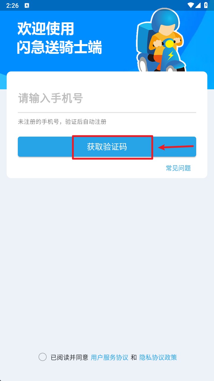 2. 点击“获取验证码”后,输入收到的短信验证码完成验证步骤,这样就可以成功登录系统,并进入到骑手的操作首页。