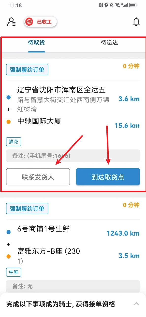 4. 在接单页面上,你会看到待取货和待送达的订单列表。点击“到达取货点”按钮,并与发货人取得联系后,就可以开始配送了。