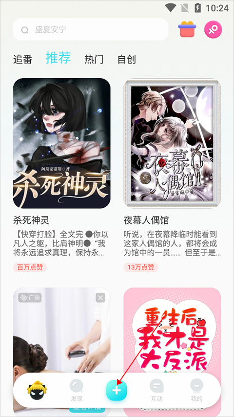 1、用户启动并登录快点阅读,进入主界面后点击底部的【+】按钮(如下图红色箭头所示)