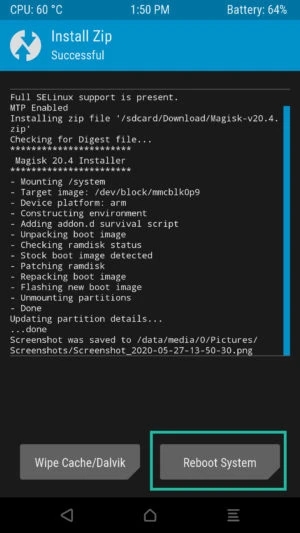 Magisk.zip已成功安装在您的设备上,打开文件,然后单击“重新启动系统”,然后查看它是否可以在您的设备上运行。