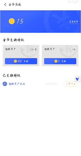 2、打开金币兑换特权,里边有超级用户一个月零金币兑换,点击零金币兑换;