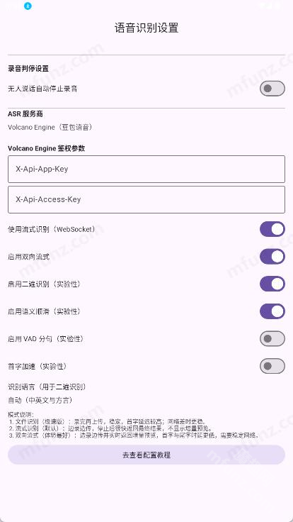在设置界面里找到“语音识别设置”选项,挑选你打算使用的ASR服务商,然后把对应的API密钥填写进去。