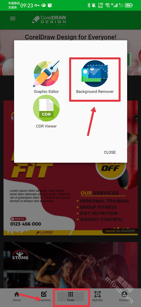 打开CDR软件后,点击底部中间位置的“Tools”选项,接着选择“Background Remover”功能。