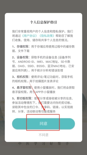 请点击同意按钮,这样就能顺利进入应用界面,开启您的中医学习之旅啦。