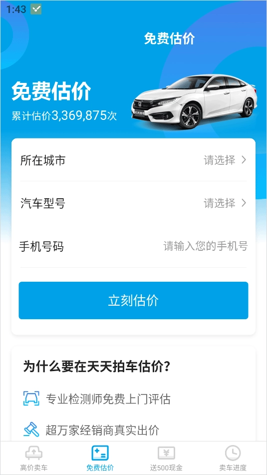 点击进入免费估价页面,选择所在城市与汽车型号,填写手机号码后,就能立即为您的爱车完成估价。