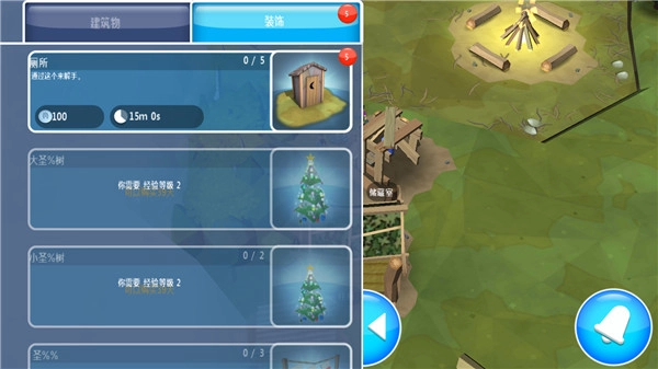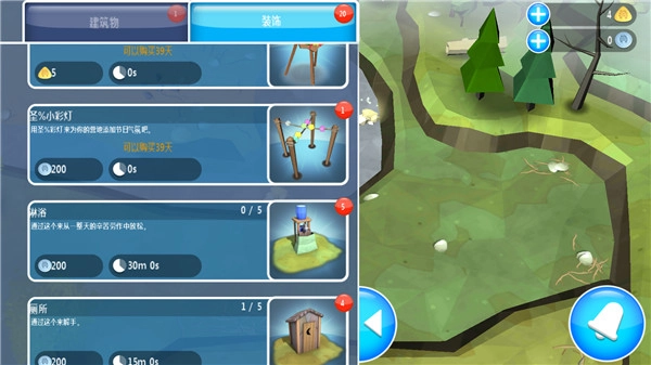游戏主要围绕建筑与采集展开,建筑物可分为装饰性和实用性两类,其中装饰性建筑支持出售。