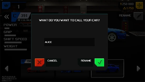 玩家能够从车库里挑选自己比较喜欢的几辆,给它们起个昵称,这些昵称会在比赛结束的时候展示出来。