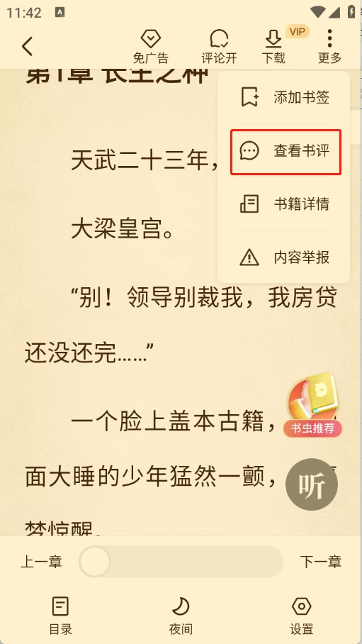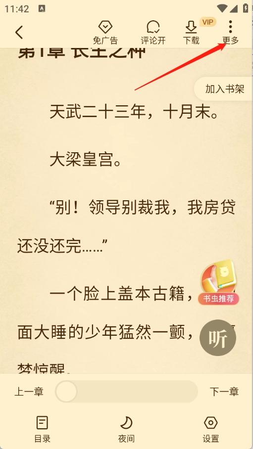 用户打开想看的小说进入阅读界面后,轻点屏幕任意一处,再点击右上角的三点图标。