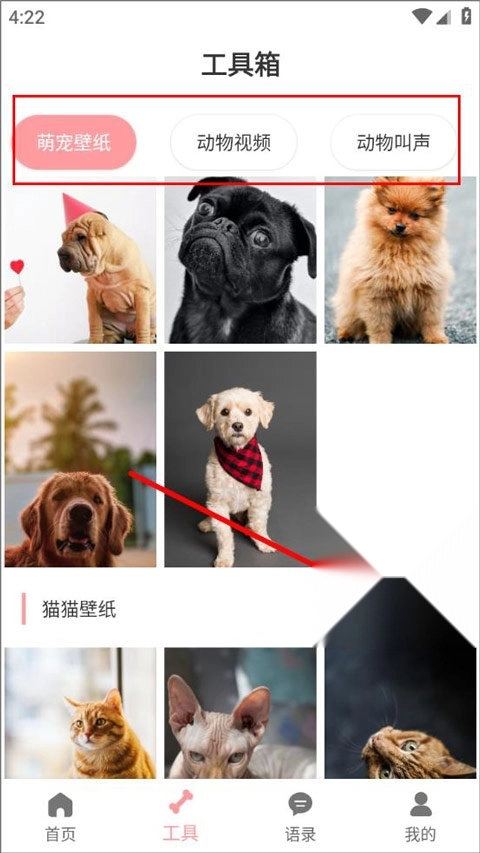 打开工具箱页面,就能查找萌宠壁纸、视频和动物叫声。