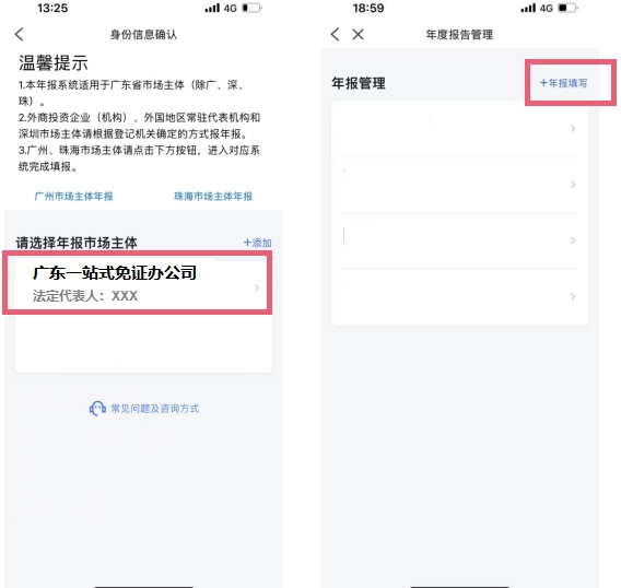 点击首页左上角的位置信息,选择年报市场主体对应的城市,依次点击【市监】-【填写年报】-【年度报告填写】,通过人脸识别验证后,就能进入年报系统。