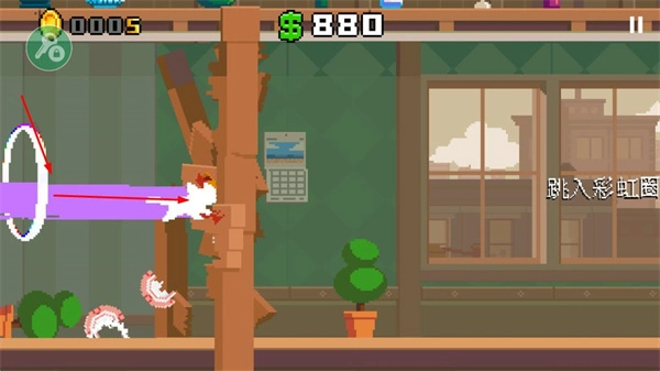 猫咪能够跃入彩虹圈,从而触发特殊效果,在场景里穿梭移动,以此破坏更多物品,进而积累金钱。