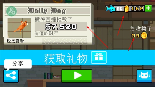 游戏结束后,系统会统计猫咪横冲直撞所摧毁的财产价值,同时显示收集到的金币数量,玩家还能获得礼物。