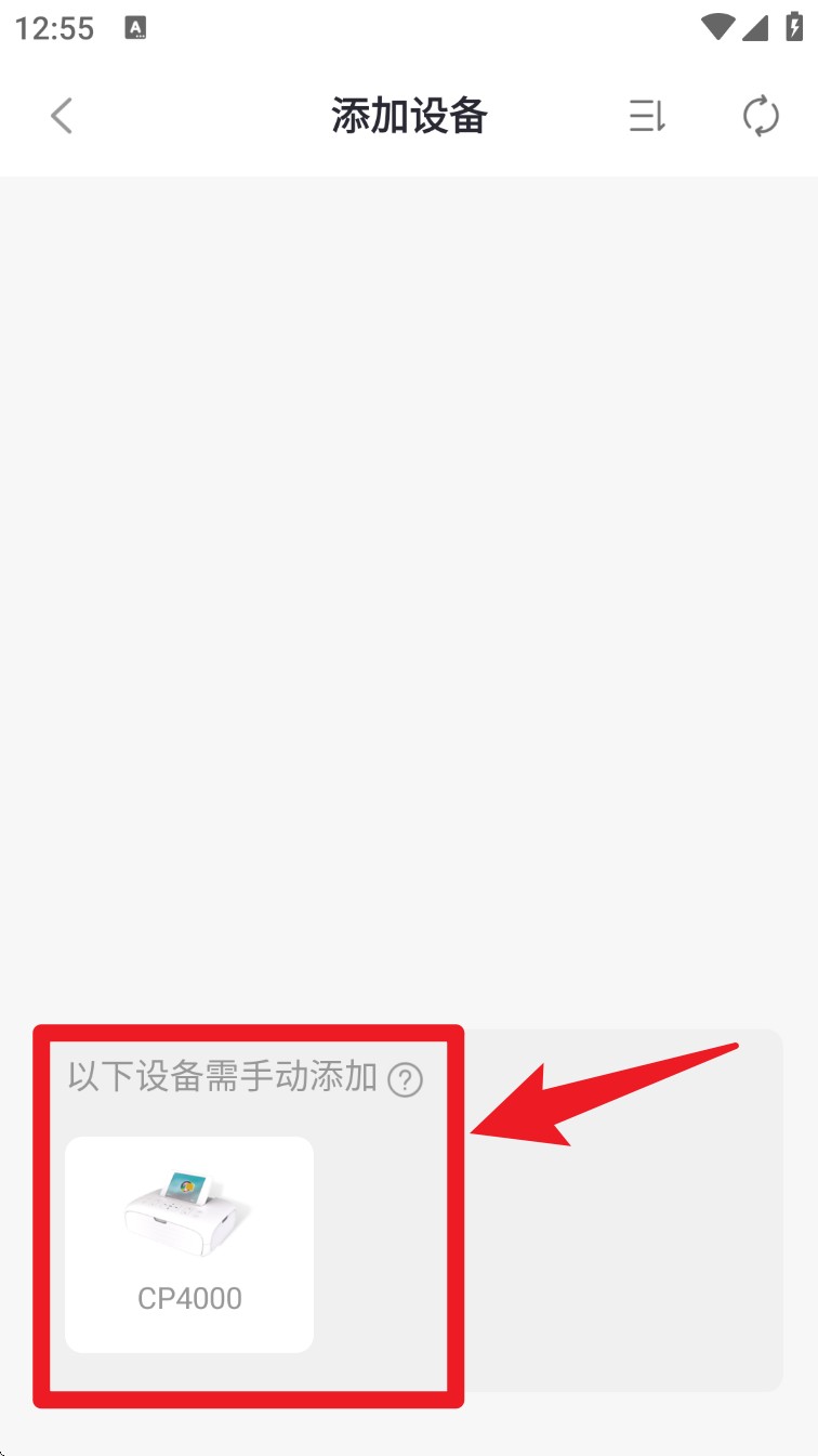 2. 进入设备添加页面,点击下方显示的设备图标(如CP4000),手动选择要连接的打印机型号,开始建立配对连接。