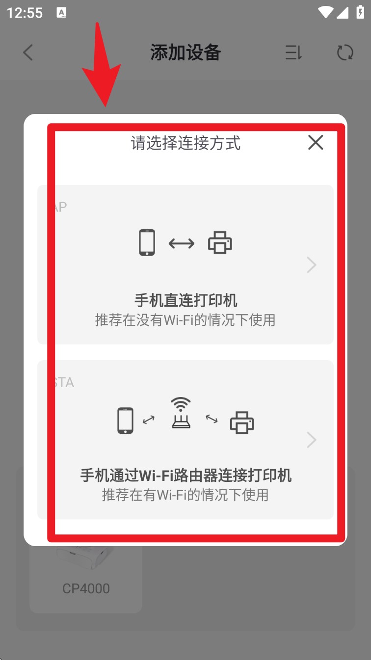 3. 出现连接方式选择框时,用户可根据网络情况选择「手机直连打印机」或「通过Wi-Fi路由连接」,适配不同场景使用。
