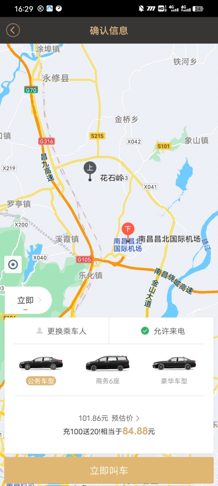 2、确认上下车信息,选择公务车型、商务6座、豪车等等型,点击立即叫车,等待司机接送即可。