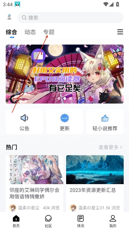 进入首页,可以点击专题。