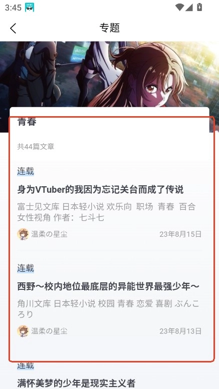例如进入“青春”板块,提供大量连载文章。