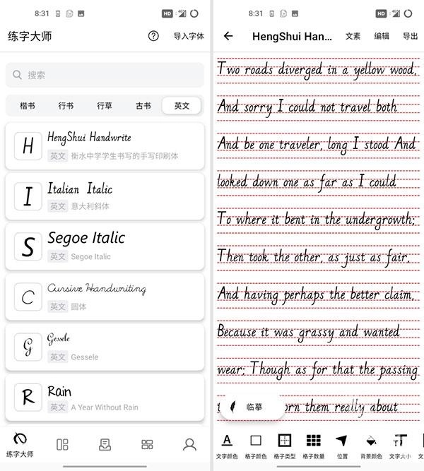 我们提供了种类丰富的字体库,用户能够挑选不同字体开展练习,以此拓展自身的写作风格,提升字体表达的丰富性。