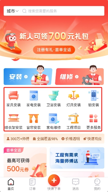 庞大的工人资源:我们拥有超10万名优质技术工人,服务网络覆盖全国600个城市以及3000多个区县。