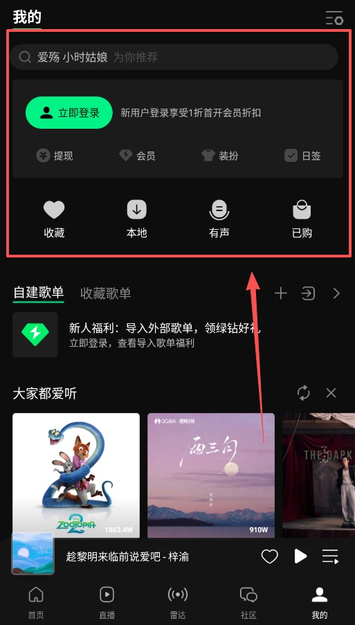 在底部导航栏找到“我的”页面,这里是你音乐库的核心区域,提现、会员、装扮等功能都集中在这里,别忘了去日签打卡哦。
