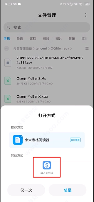 在选择器面板里找到“导入到钱迹”并点击,之后如果有“仅此一次”按钮就点击(部分手机可能没有这个步骤,直接跳过即可)