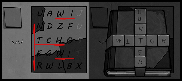 按照字母提示解开笔记本上的十字锁,操作示意图如下。解开后得到七巧板,完成七巧板游戏可获得提示“1T”。