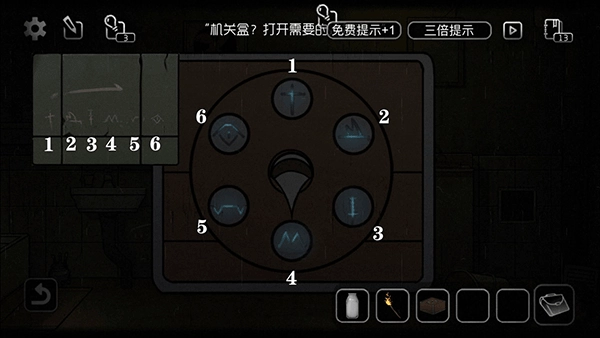 点击窗户可获取提示。提示里的位置对应相框位置,把相应卡片放入对应的相框中,如图↓所示。操作正确后,排风扇会掉落,即可获得【装置钥匙】