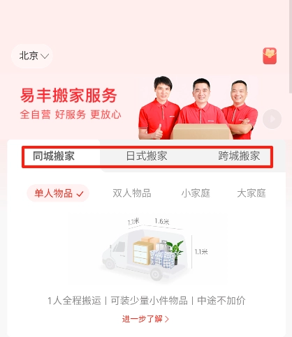 在首页挑选同城搬家、跨市搬家等所需的搬家服务类型。