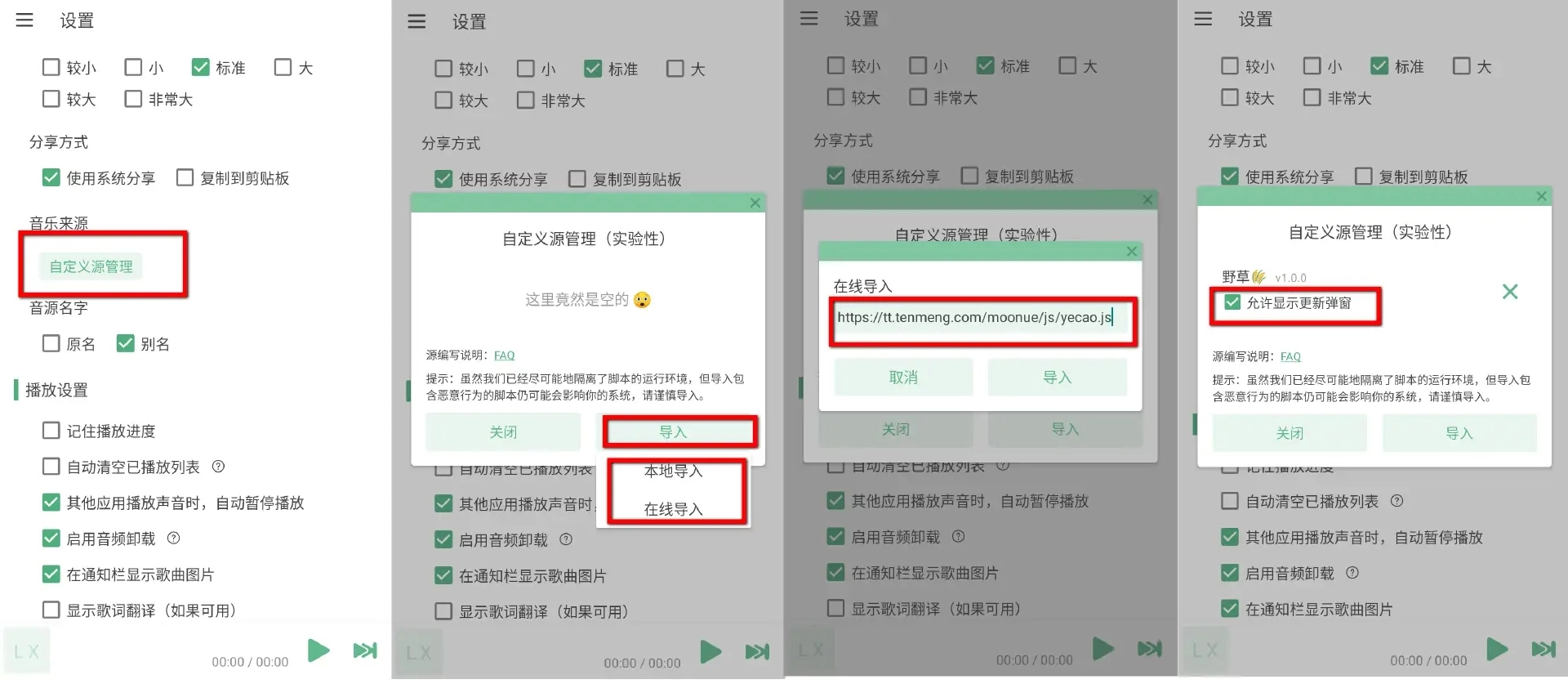 【设置】→【导入】→【在线导入】或【本地导入】→输入音乐地址→全选导入的音源