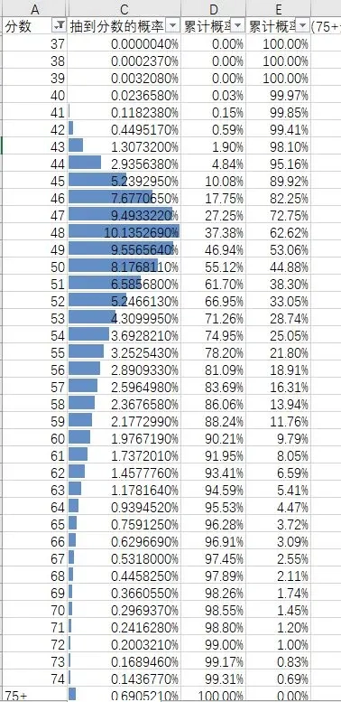 抽到42分的概率比75分以上还要低,所以抽到42分的运气,大概就相当于抽到了吧(溜