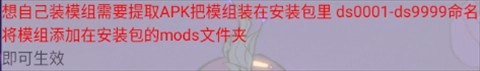 用MT管理器提取APK文件,把模组文件放进安装包内的mods文件夹,命名为ds0001到ds9999之间的任意编号就行。