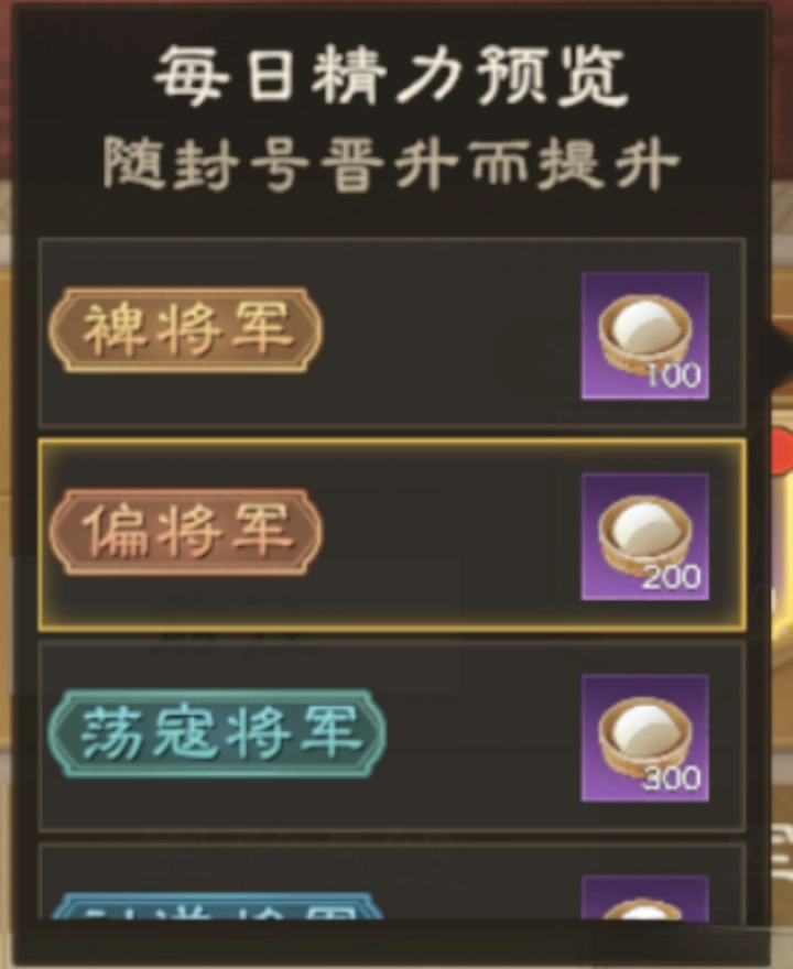 每日获取的精力还和军阶有关联。阿武这儿有个小窍门,主公先别急着领取,等军阶提升之后再去领,就能悄悄多赚一点!