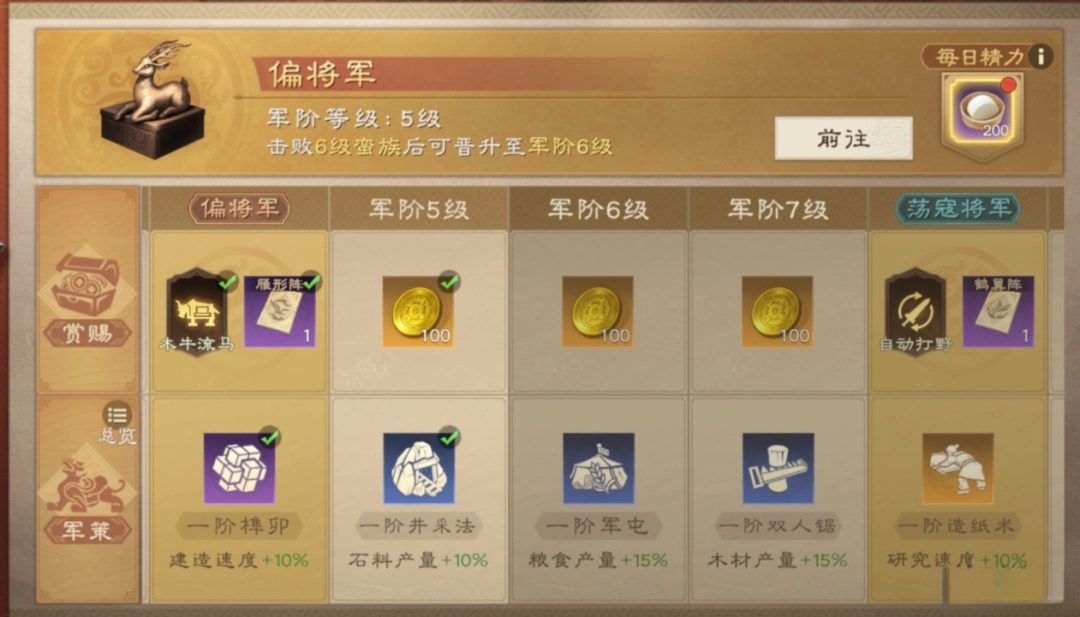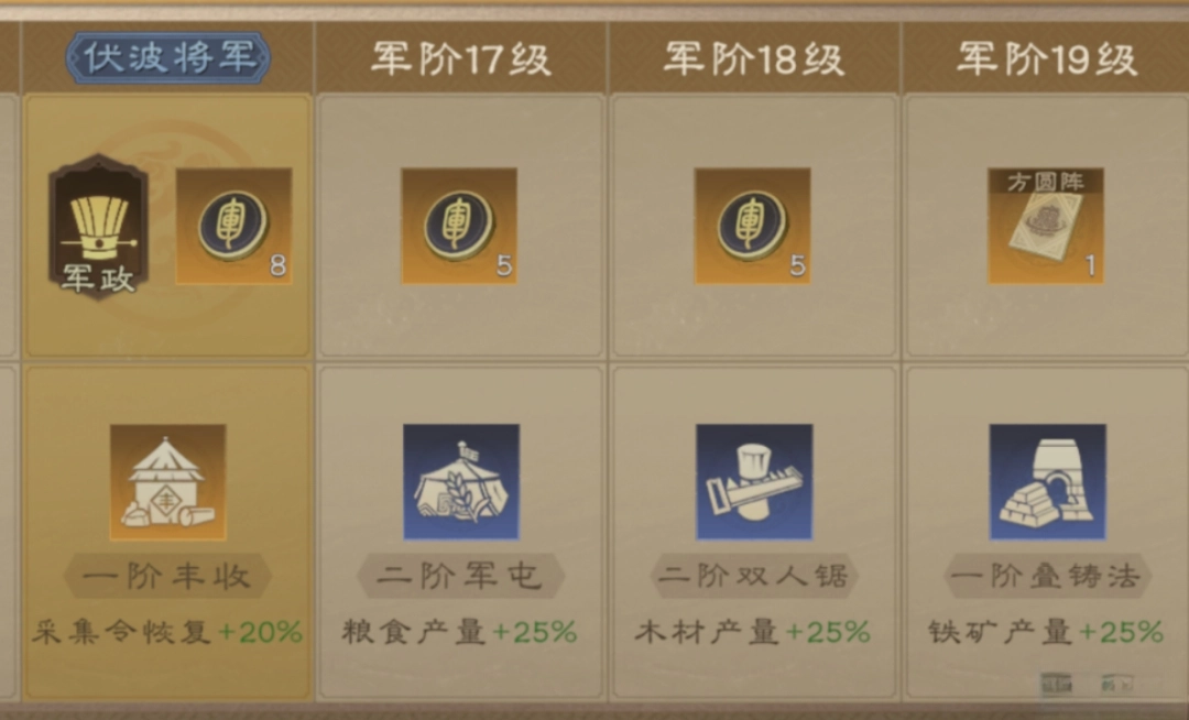 军阶还与军政系统密切相关,比如解锁高阶兵种、提升各类资源产量等,因此主公务必尽快升级军阶!