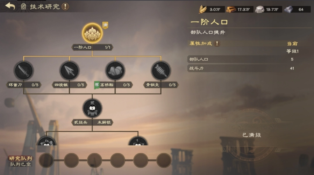 这里优先建议钻研人口技术与兵种等级技术,能显著增强战斗力。