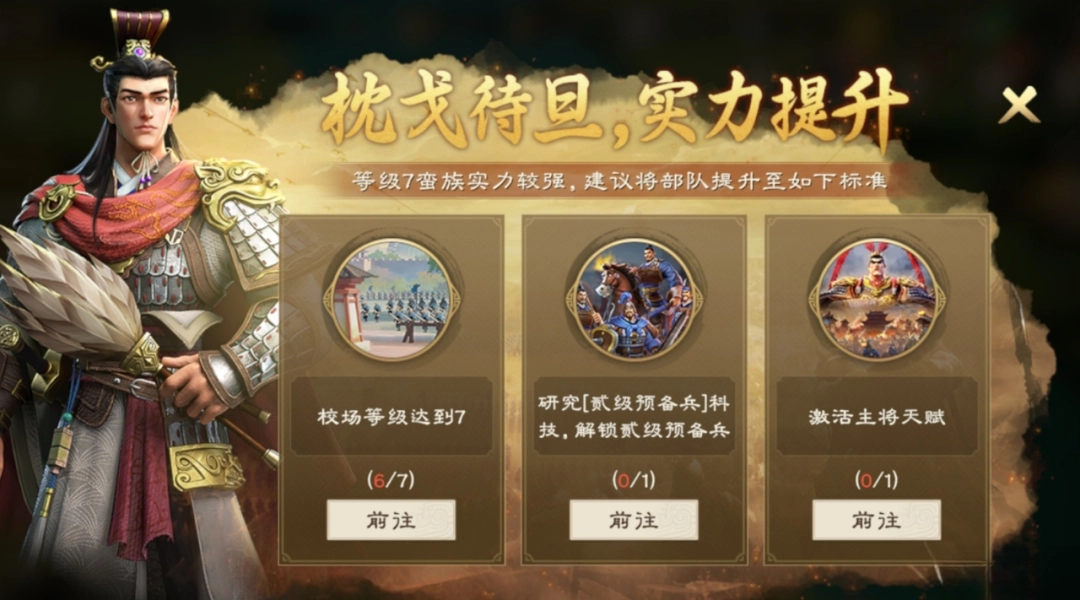 当无法战胜高阶蛮族时,意味着当前战力已达瓶颈,需进一步突破。这里有一些提升战力的小建议,主公也可在失败后依据系统提示来增强实力。