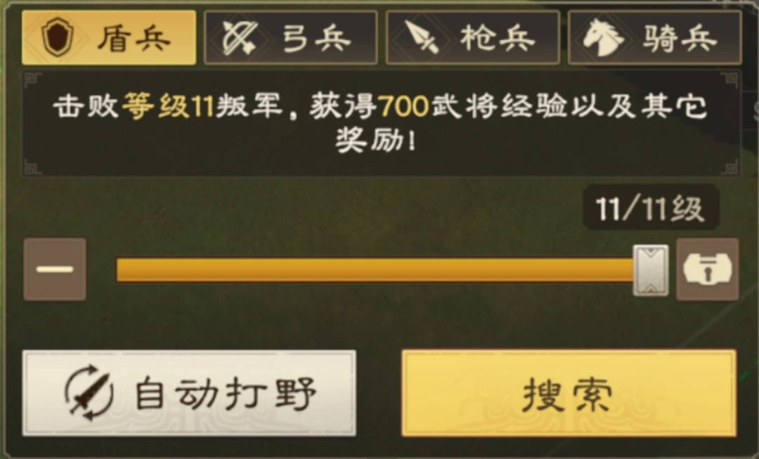 注意,军阶达到8级后就能开启自动打野功能了。不过主公要特别注意哦,得先把当前能打过的最高等级蛮族都通关了,再去扫荡叛军才行。这是因为叛军的等级是和蛮族挂钩的,如果先去扫荡等级比较低的叛军,主公可是会损失不少经验的!