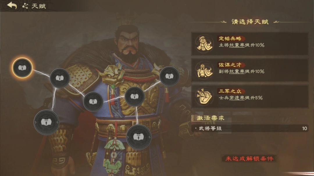 武将每提升10级等级,就能增加天赋等级,进而提高战力。