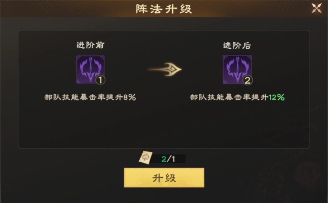 主公可以通过更换更强更优的五星阵法,或是对自身已有的阵法进行升级,以此来增强战斗力!