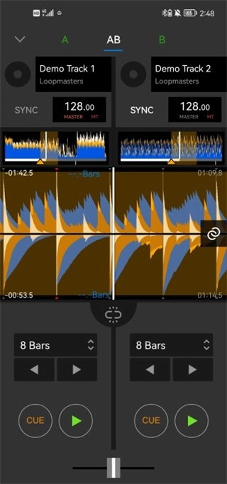 用户能够听到经过一段时间后的混音效果。该功能会同步播放两首曲目,无论进行跳拍操作还是滑动波形,两首曲目都会保持相同的移动量。