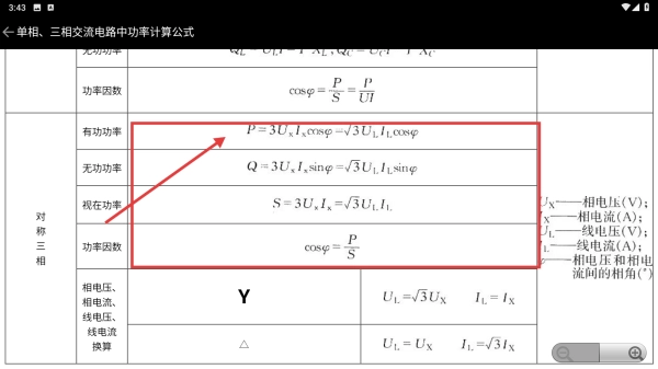 3、进入公式详情页,查看对称三相电路的有功功率、无功功率等计算公式,辅助电工学习计算。