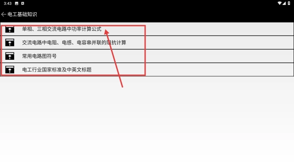 1. 开启电工专家应用程序,于电工资料页面中,点击“电工基础知识”选项,随即进入知识分类详情页面。
