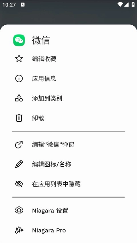 长按任意应用,弹出的对话框里能快速查看该应用的信息、编辑图标名称、进行弹窗设置以及卸载等快捷操作,接着点击下方的【Niagara设置】功能即可。