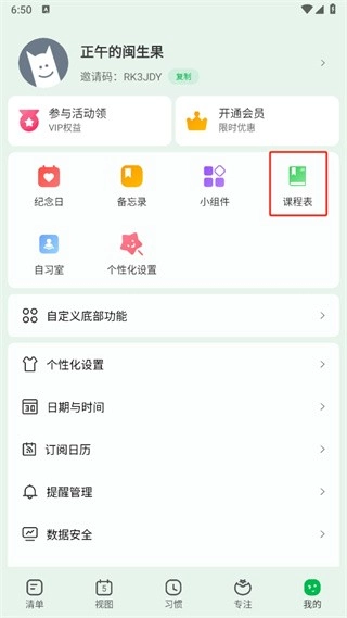 在我的页面,点击【课程表】服务。