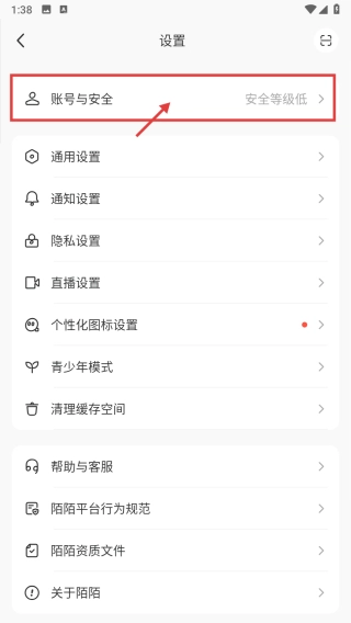 在设置页面中,找到并点击“账号与安全”选项,即可进入对应的账号与安全页面。