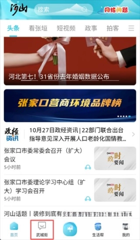 启动河山新闻App后,可选择点击【武城街】板块,也能按下【+号】按钮。