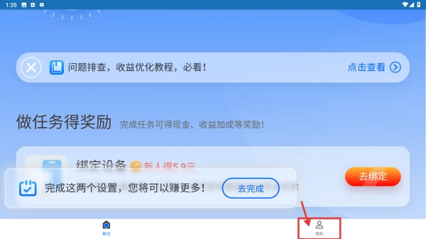 打开收益类应用,点击底部的“我的”选项,进入个人中心页面。