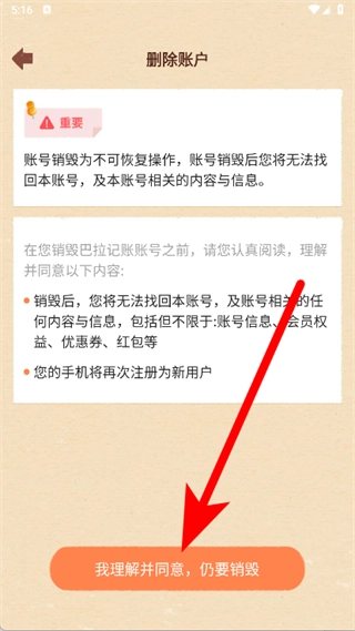 在删除账户页面,点击我理解并同意,仍要销毁。
