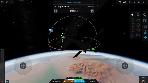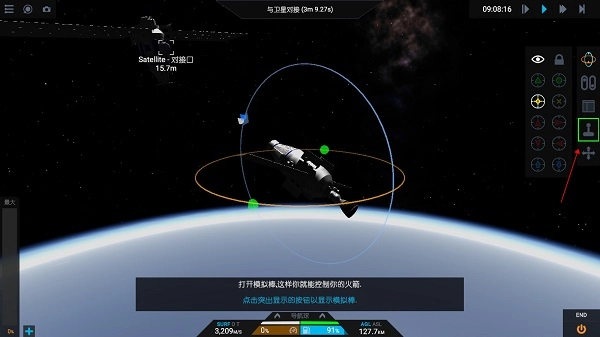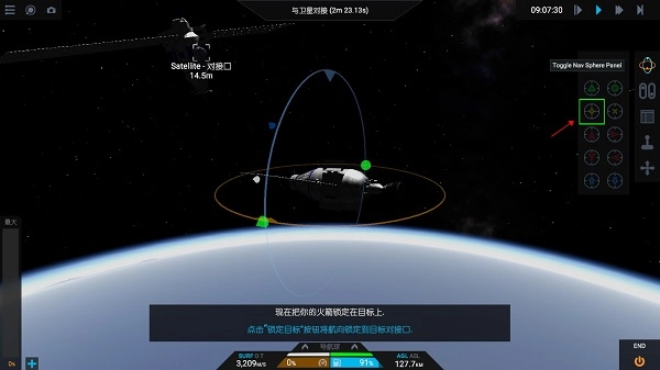 现在将你的火箭锁定在目标上,具体操作是点击屏幕右侧的按钮来显示导航球面板。