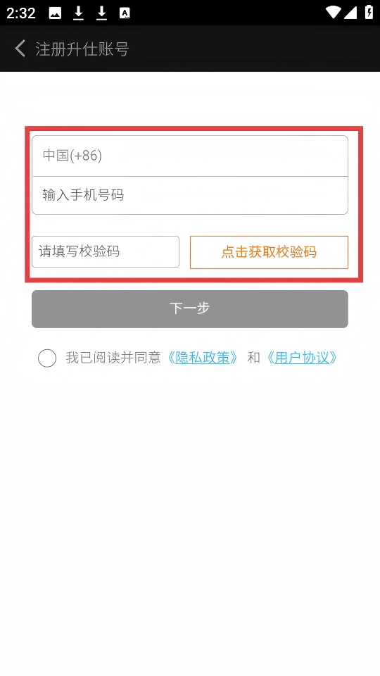 在注册页面的输入框中填写手机号码,接着点击“点击获取校验码”按钮,待收到校验码后将其填入对应位置,就能继续进行后续操作。